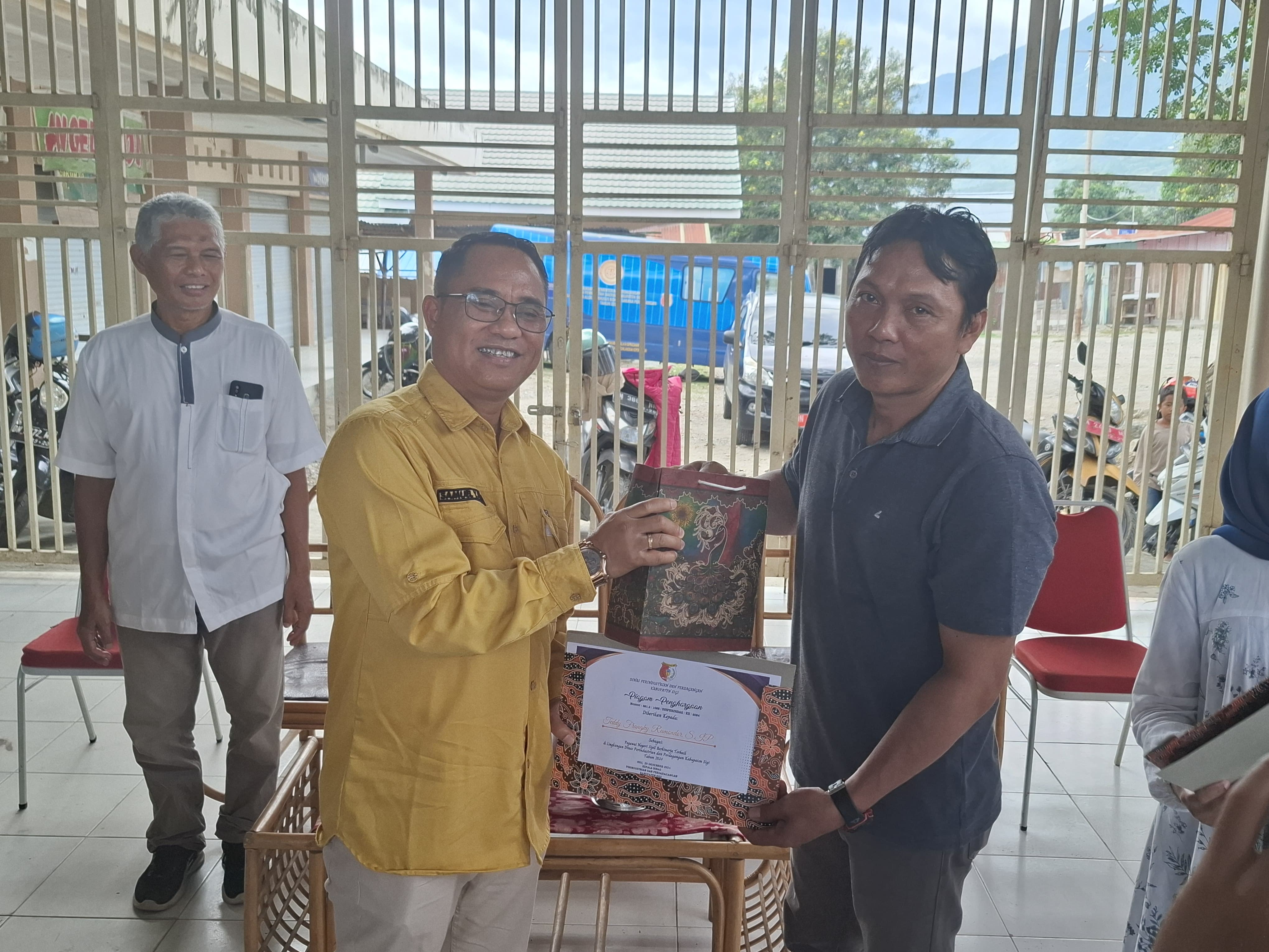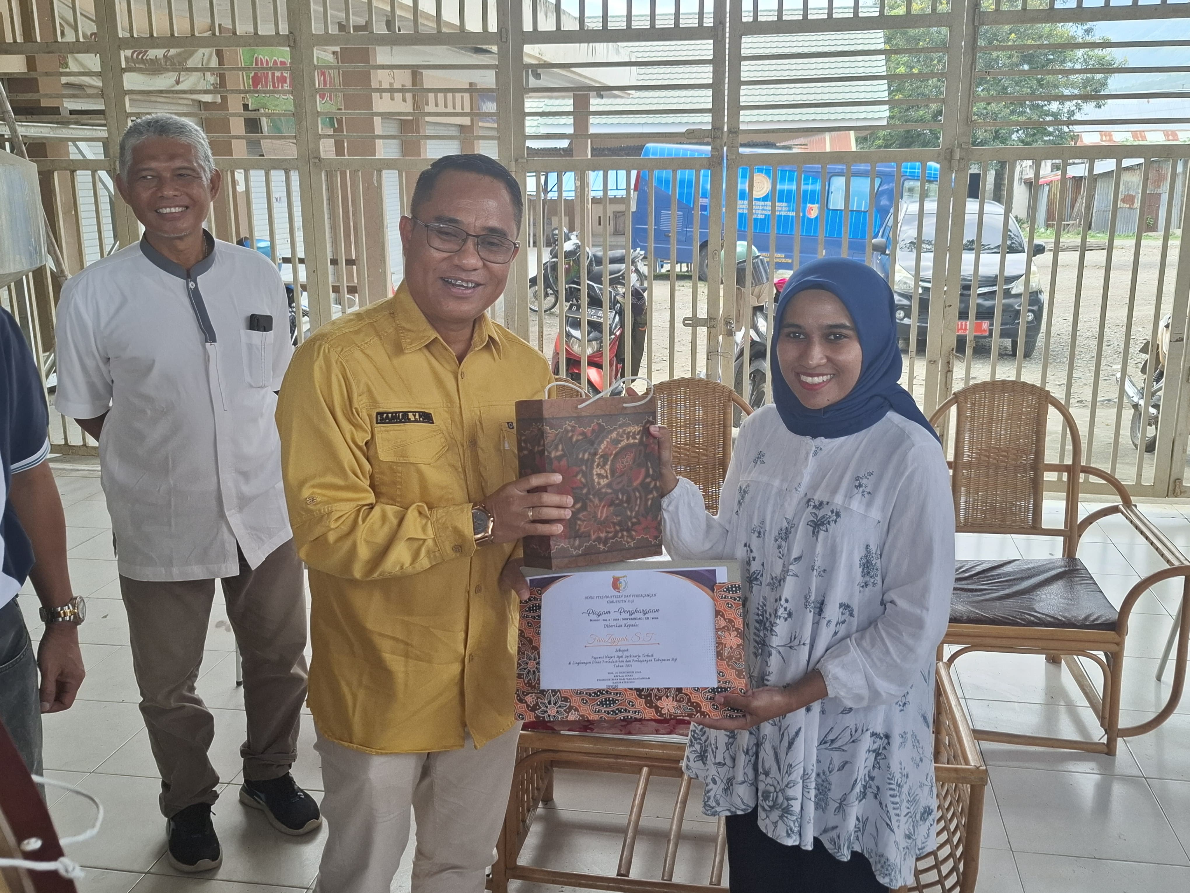 Dirangkaikan dengan acara penyerahan bantuan mesin peralatan kepada para pelaku Industri Kecil dan Menengah, pada hari Jumat, tanggal 20 Desember 2024, turut diserahkan penghargaan kepada Pegawai Negeri Sipil (PNS) Berkinerja Terbaik Tahun 2024 di lingkungan Dinas Perindustrian dan Perdagangan Kabupaten Sigi. Piagam penghargaan dan cendera mata untuk PNS berkinerja terbaik langsung diserahkan oleh Wakil Bupati Sigi, Dr. Samuel Yansen Pongi, SE., M.Si. kepada 2 orang PNS atas nama TEDDY FRANGKY RUMONDOR, S.IP. (Pengadministrasi Umum) dan FAUZIYYAH, ST. (Analis Dunia Usaha).