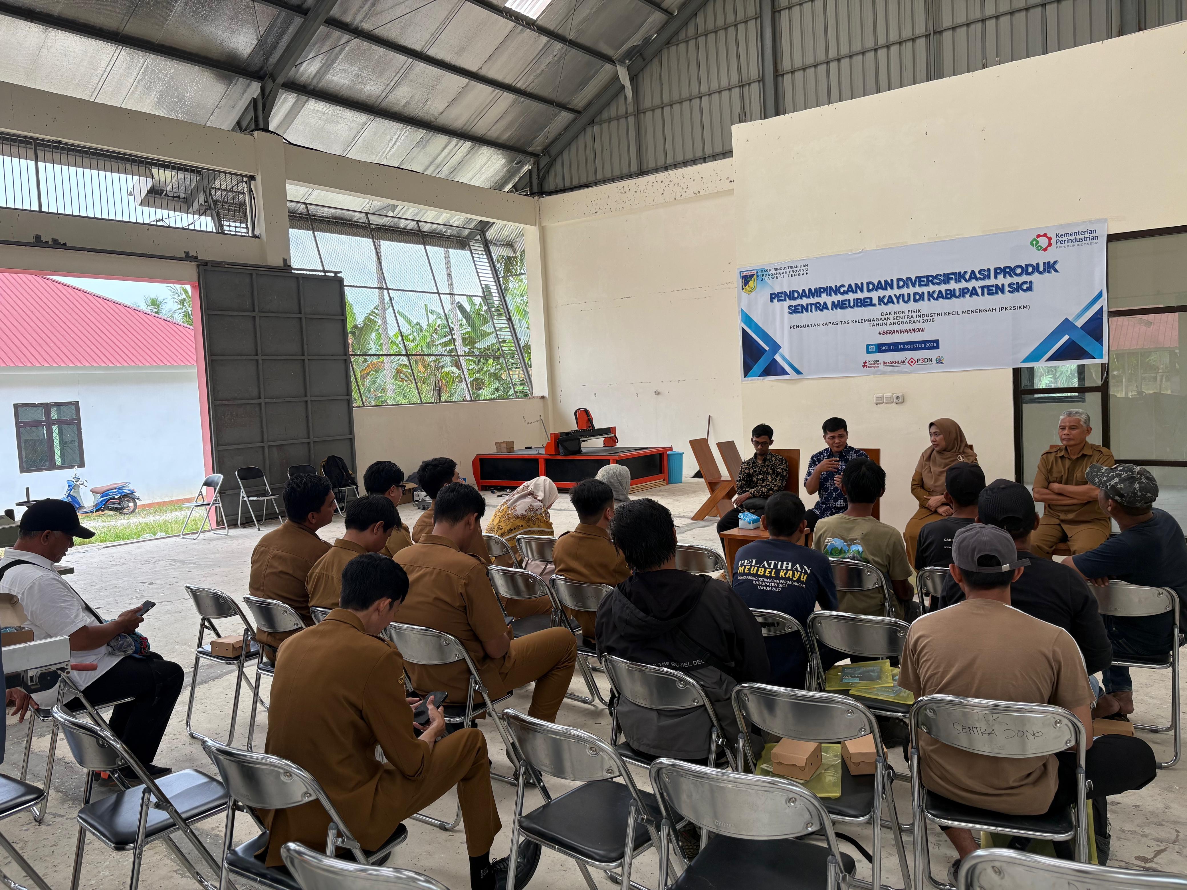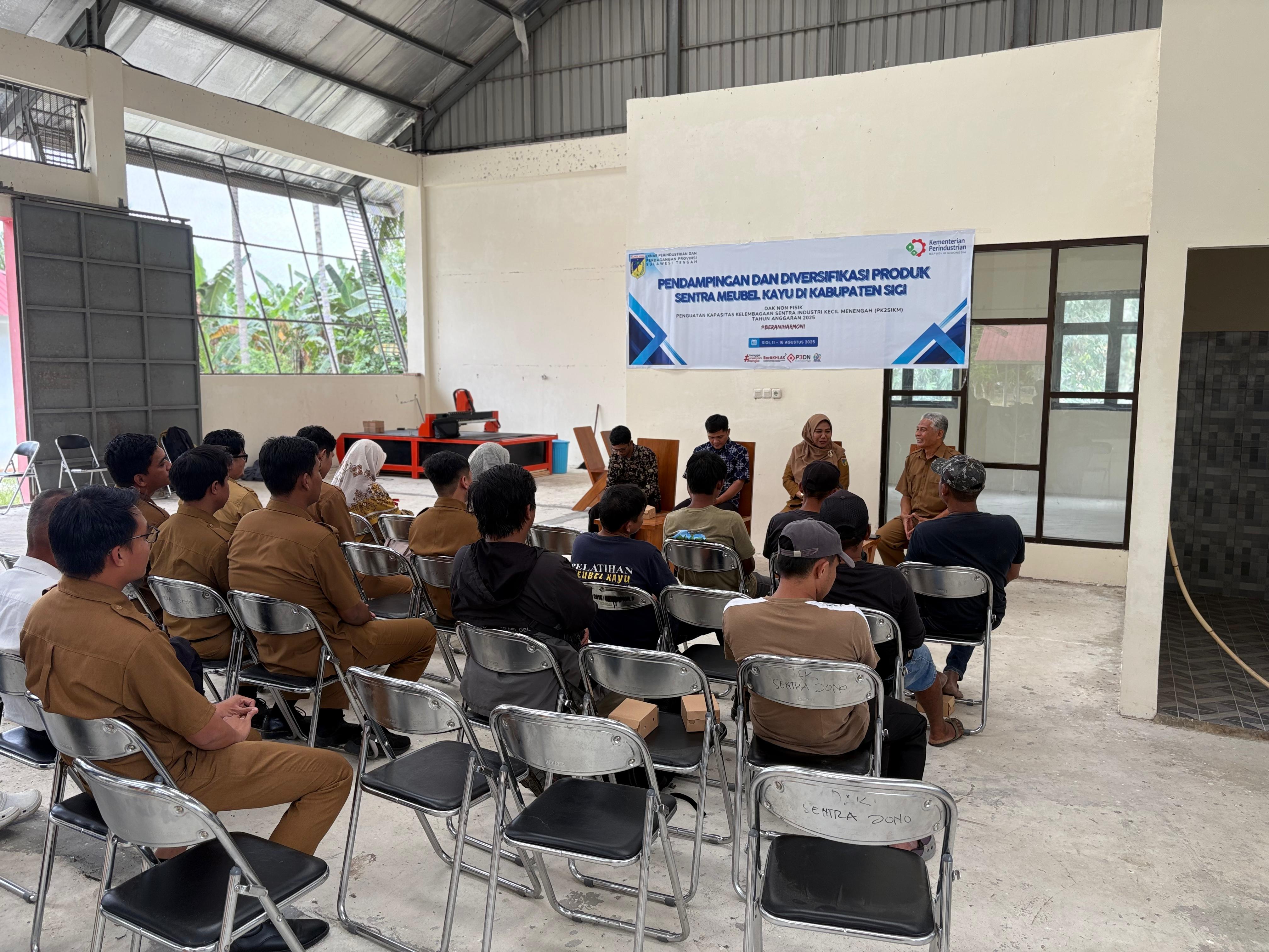 Melalui kerja sama dengan Dinas Perindustrian dan Perdagangan Provinsi Sulawesi Tengah, Dinas Perindustrian dan Perdagangan Kabupaten Sigi secara resmi membuka kegiatan Pendampingan dan Diversifikasi Produk Sentra Mebel Kayu pada hari Senin (11/8/2025). Kegiatan ini diabiayai melalui Dana Alokasi Khusus (DAK) Non Fisik Penguatan Kapasitas Kelembagaan Sentra Industri Kecil Menengah (PK2SIKM) Tahun Anggaran 2025.