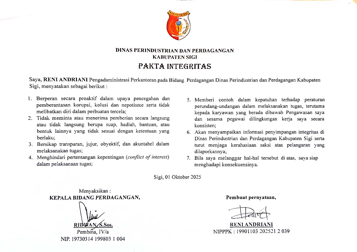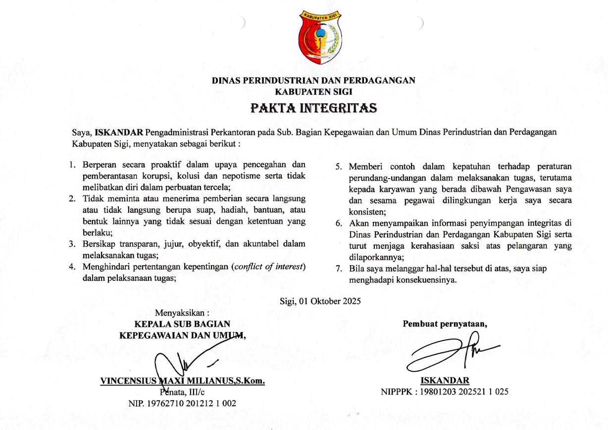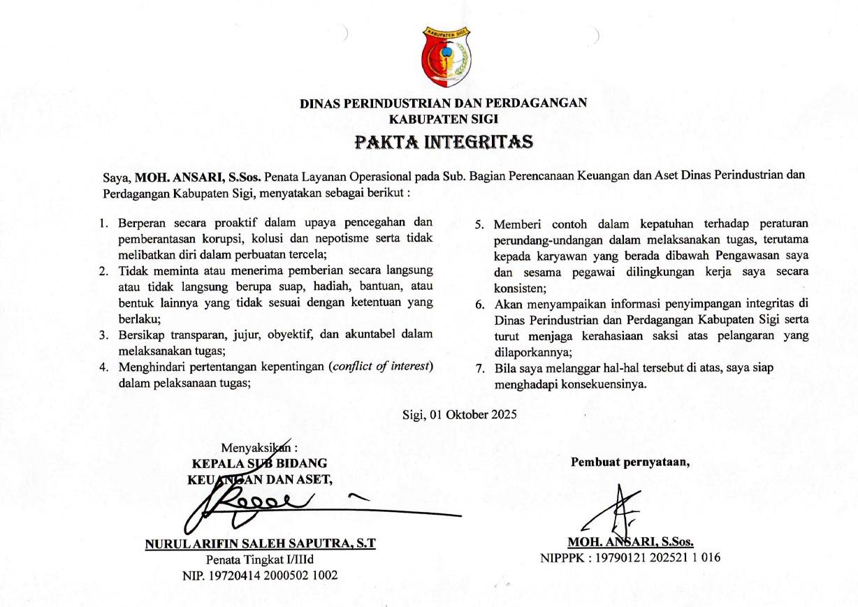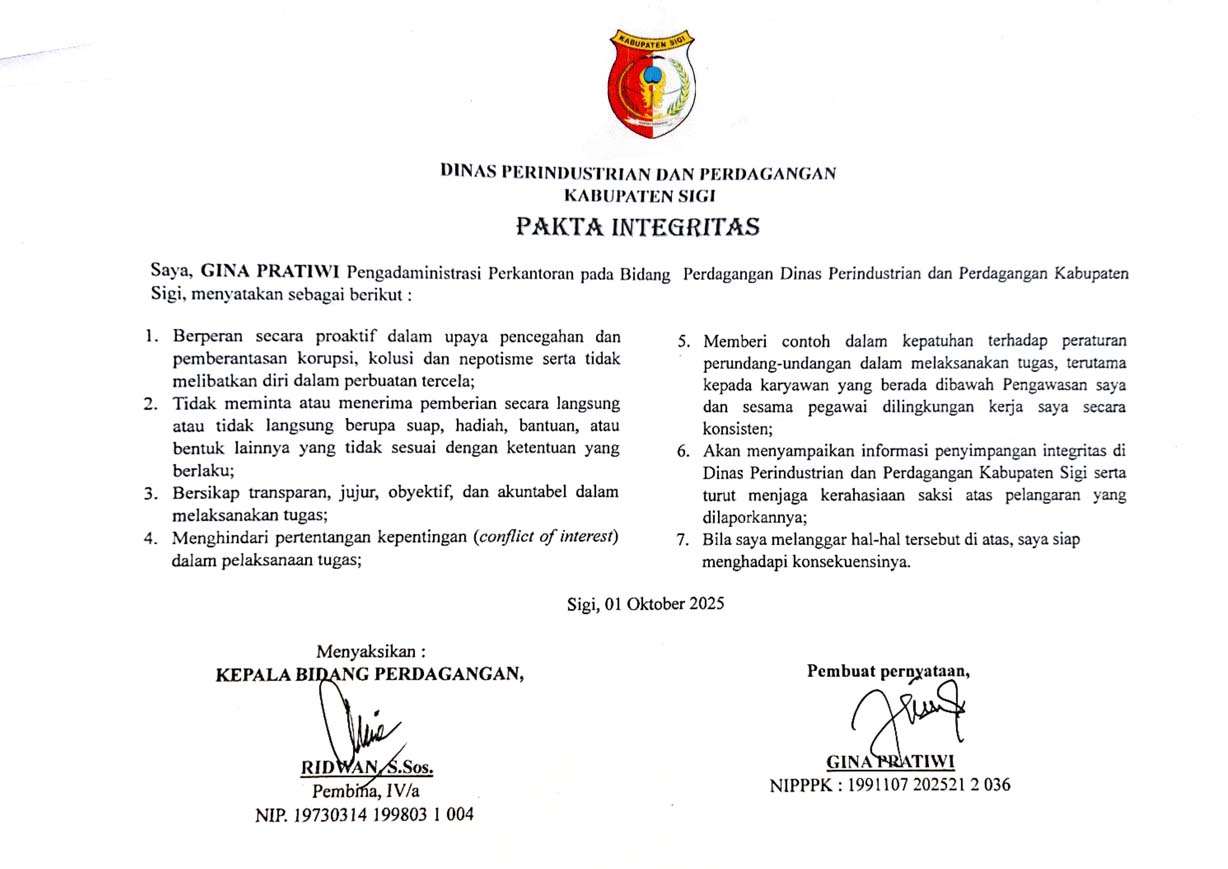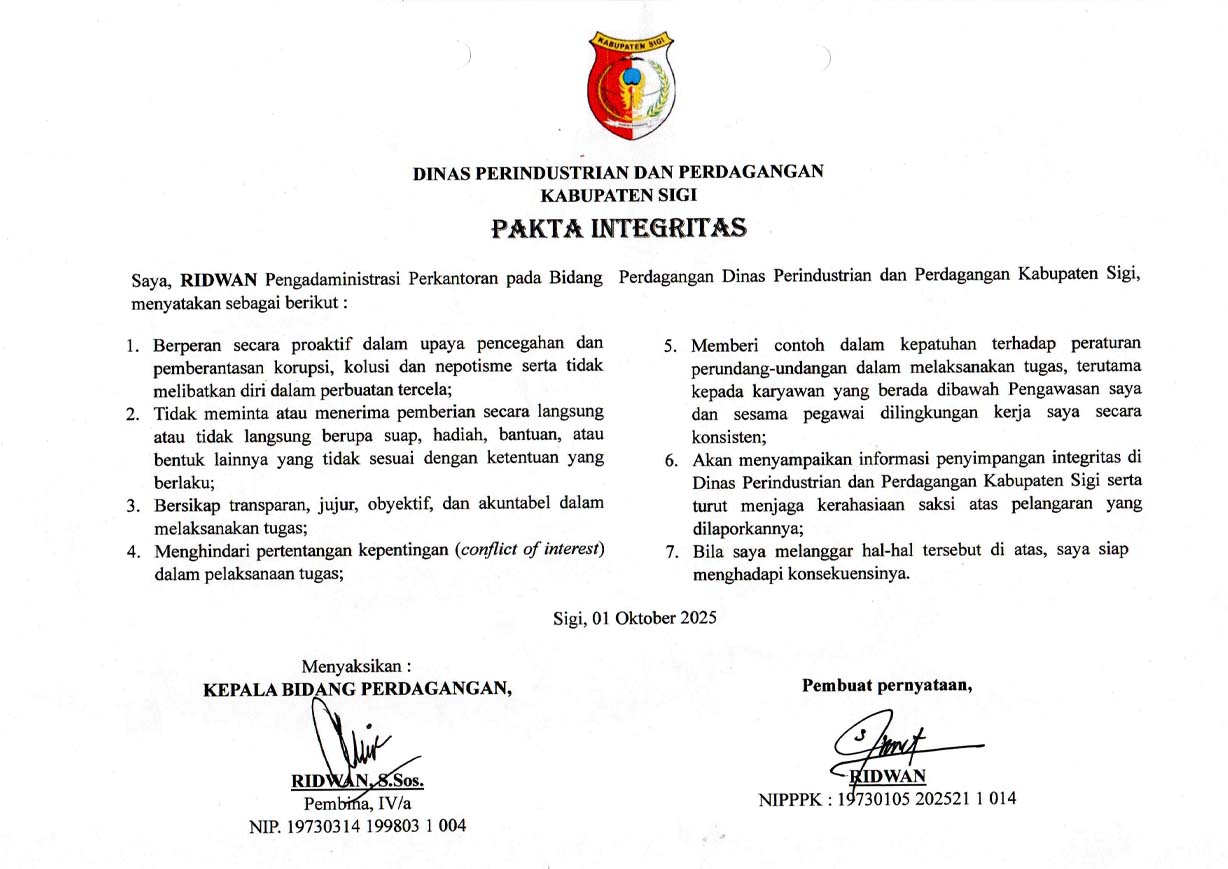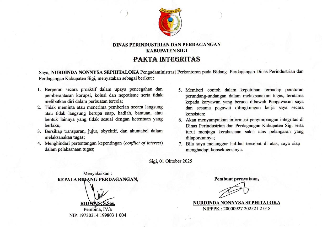 Penandatanganan Dokumen Pakta Integritas pada Dinas Perindustrian dan Perdagangan Kabupaten Sigi.