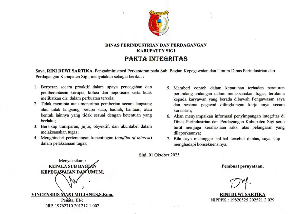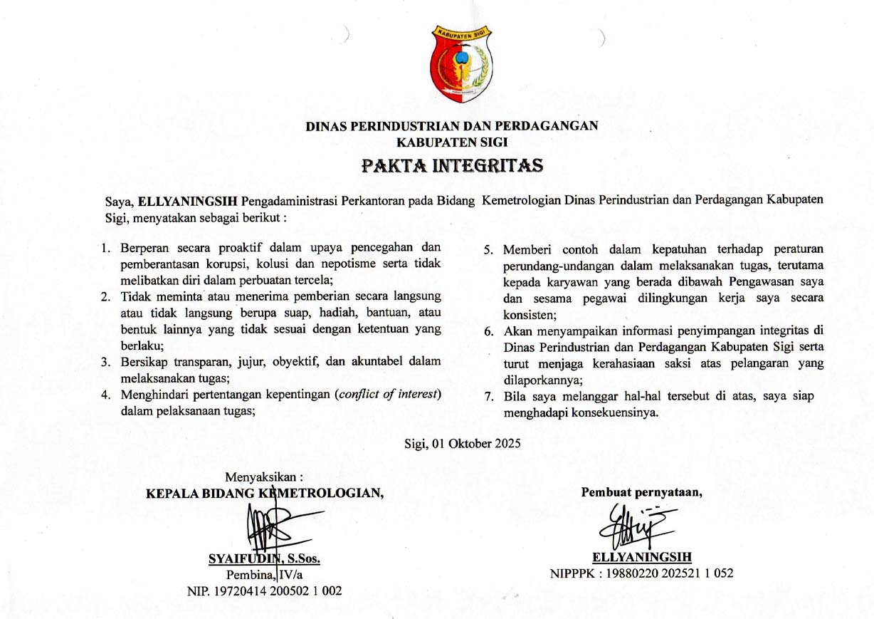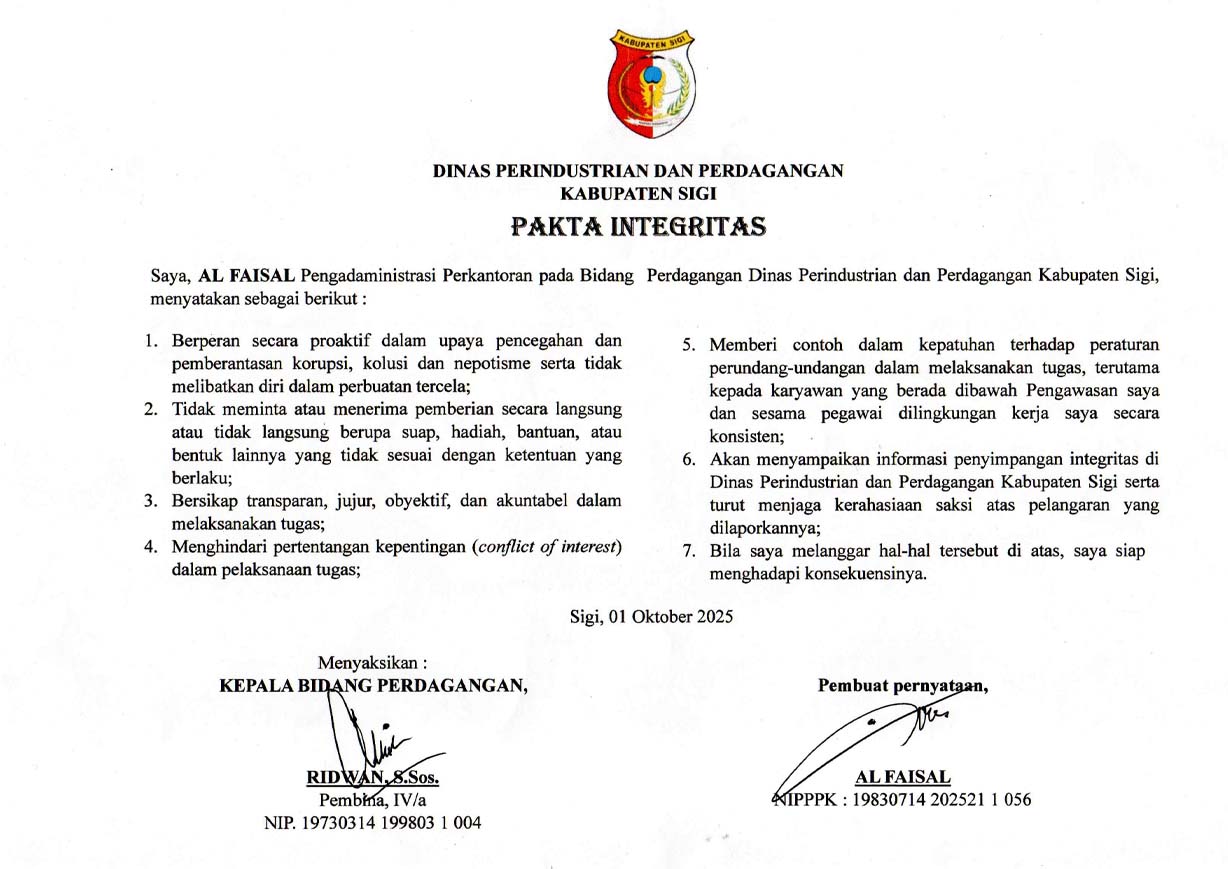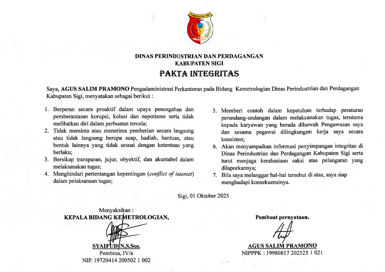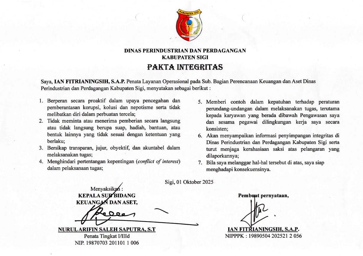 Penandatanganan Dokumen Pakta Integritas pada Dinas Perindustrian dan Perdagangan Kabupaten Sigi.