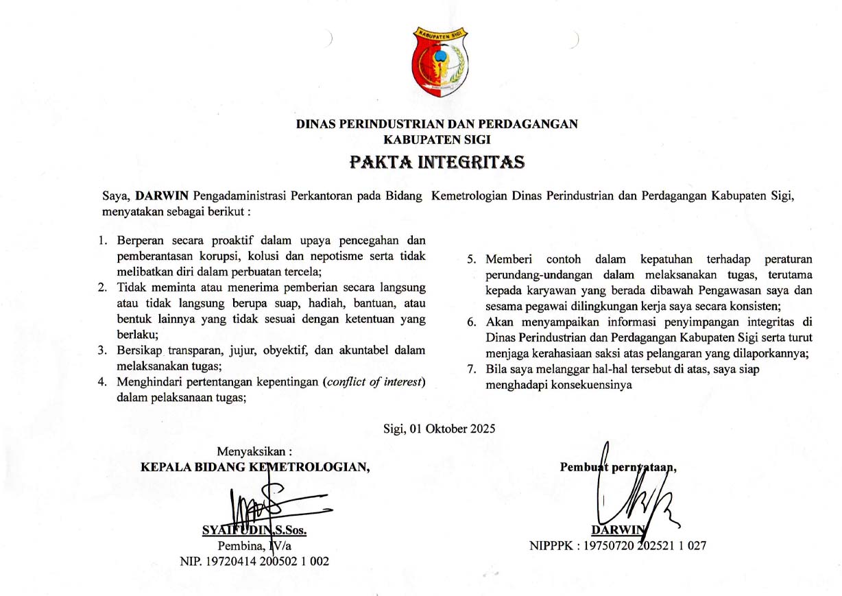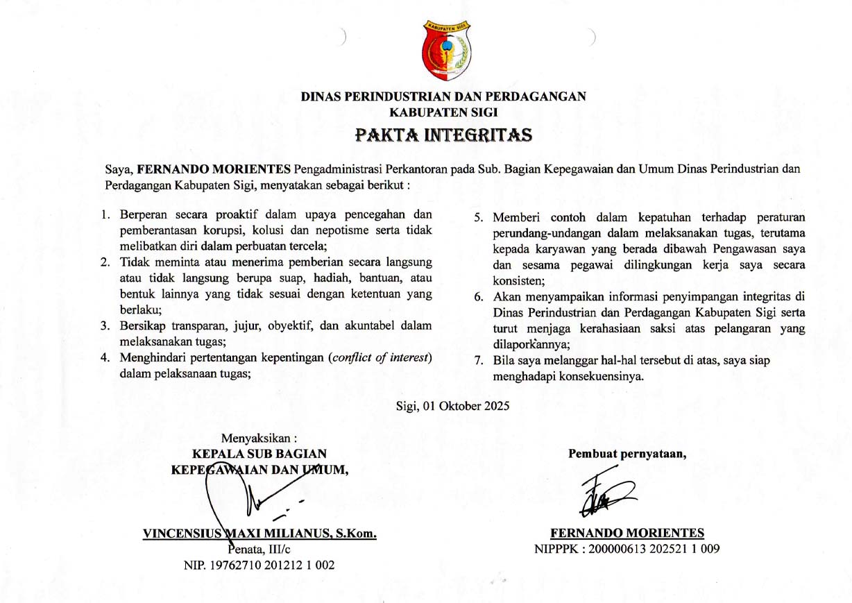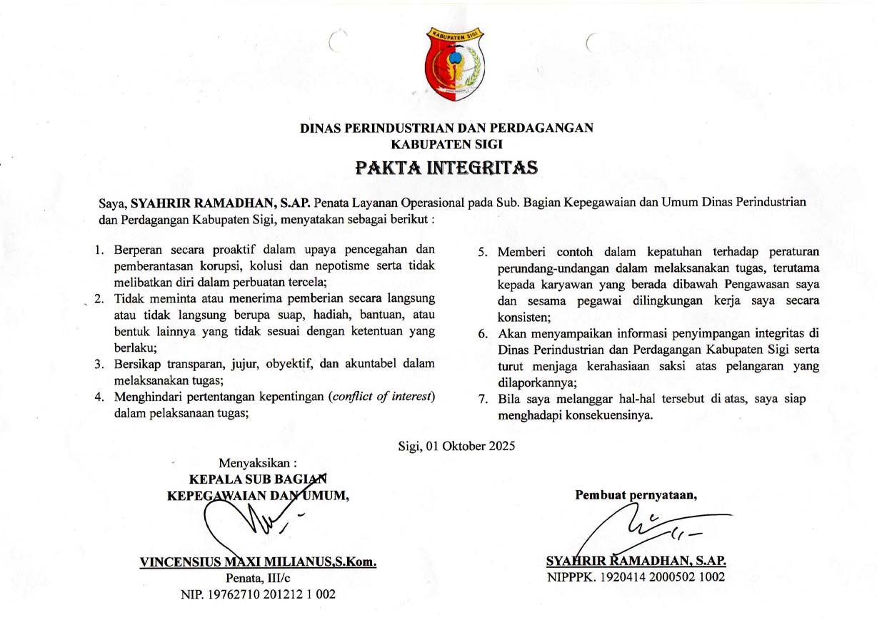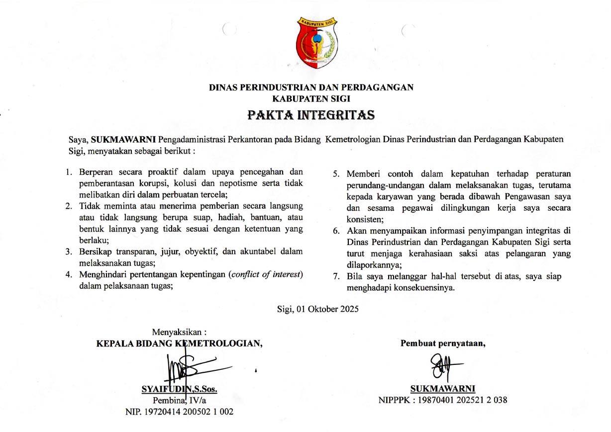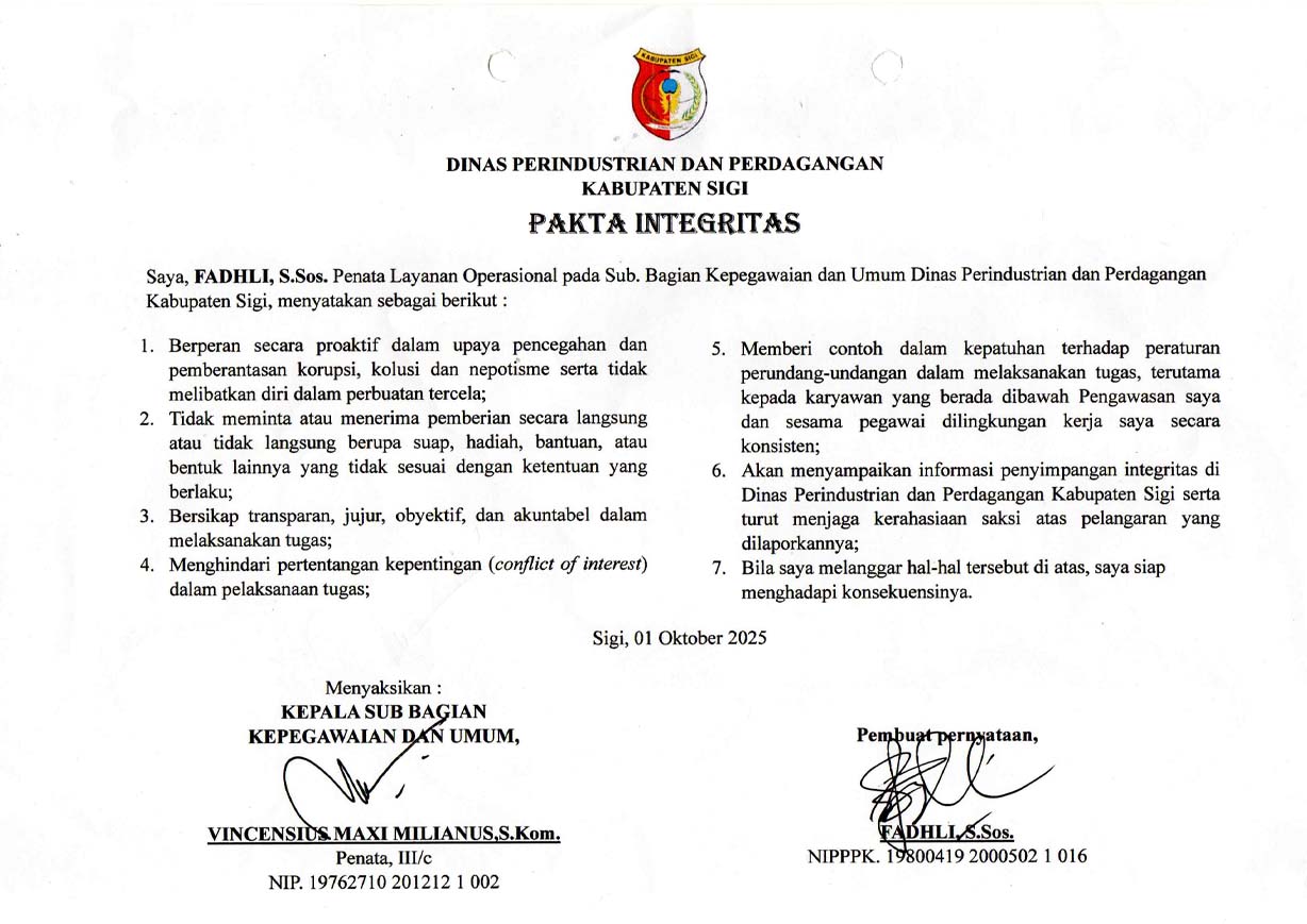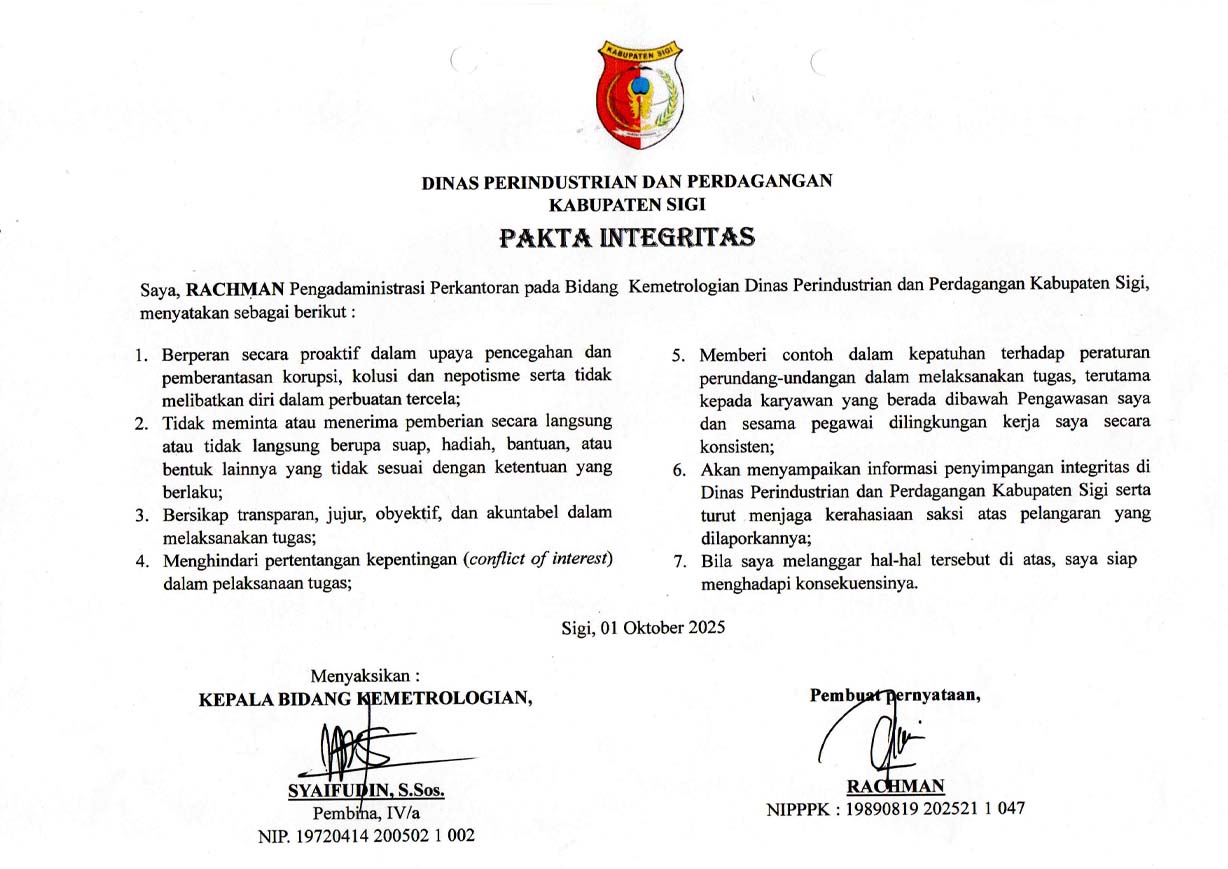 Penandatanganan Dokumen Pakta Integritas pada Dinas Perindustrian dan Perdagangan Kabupaten Sigi.