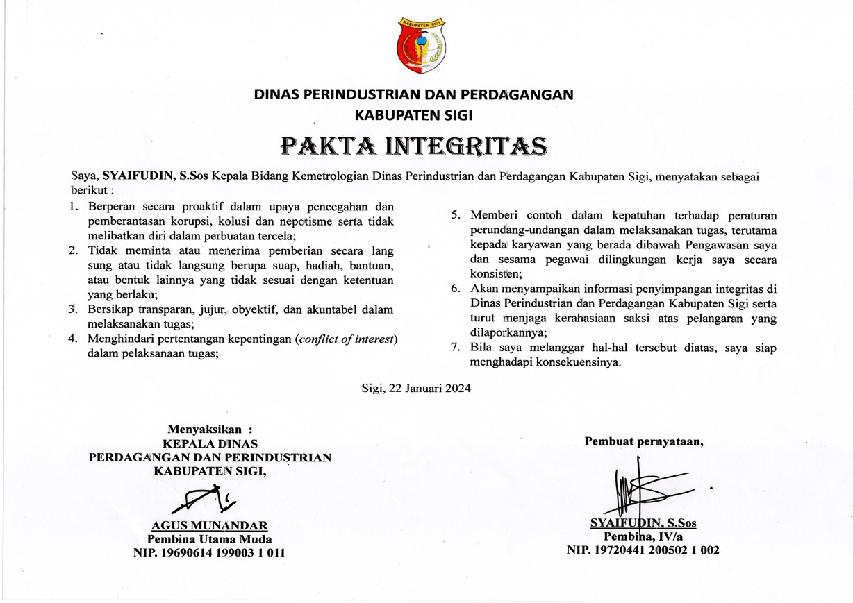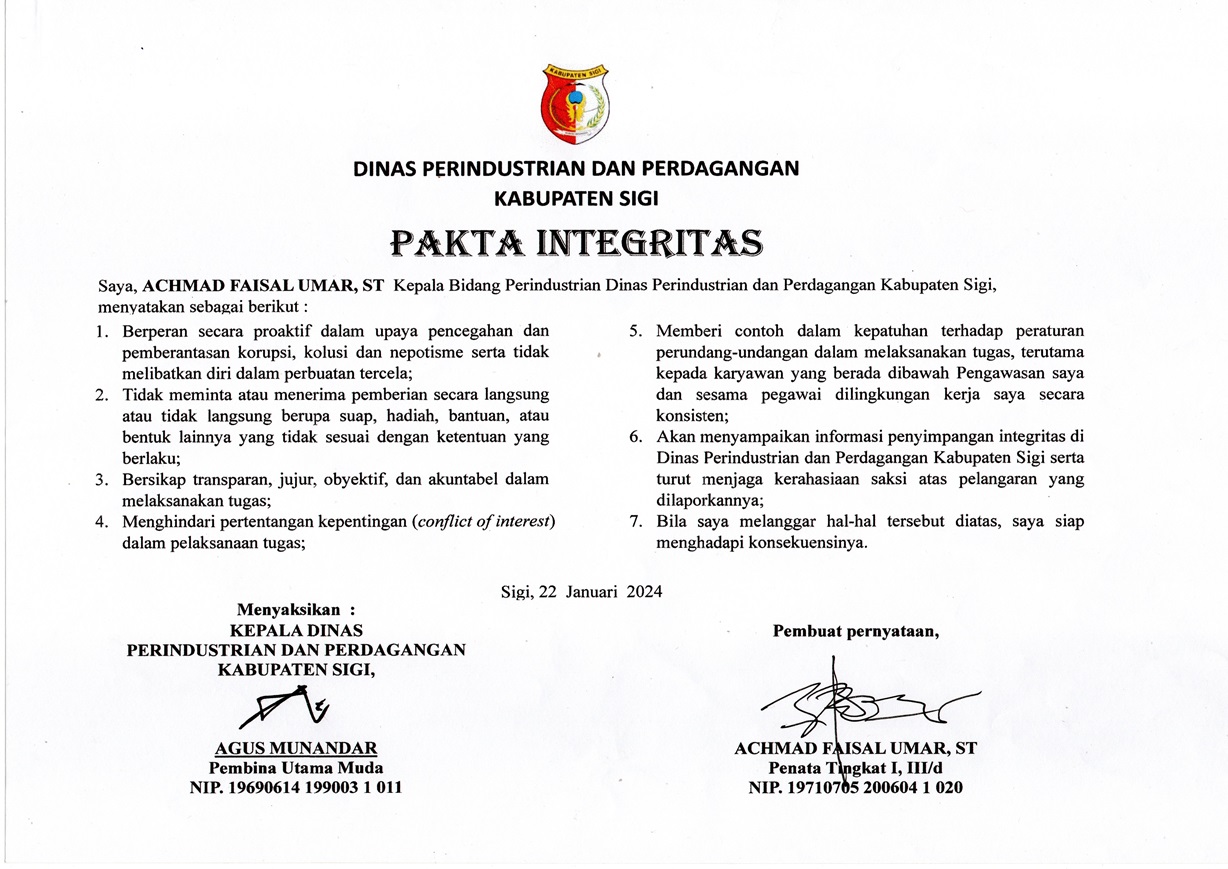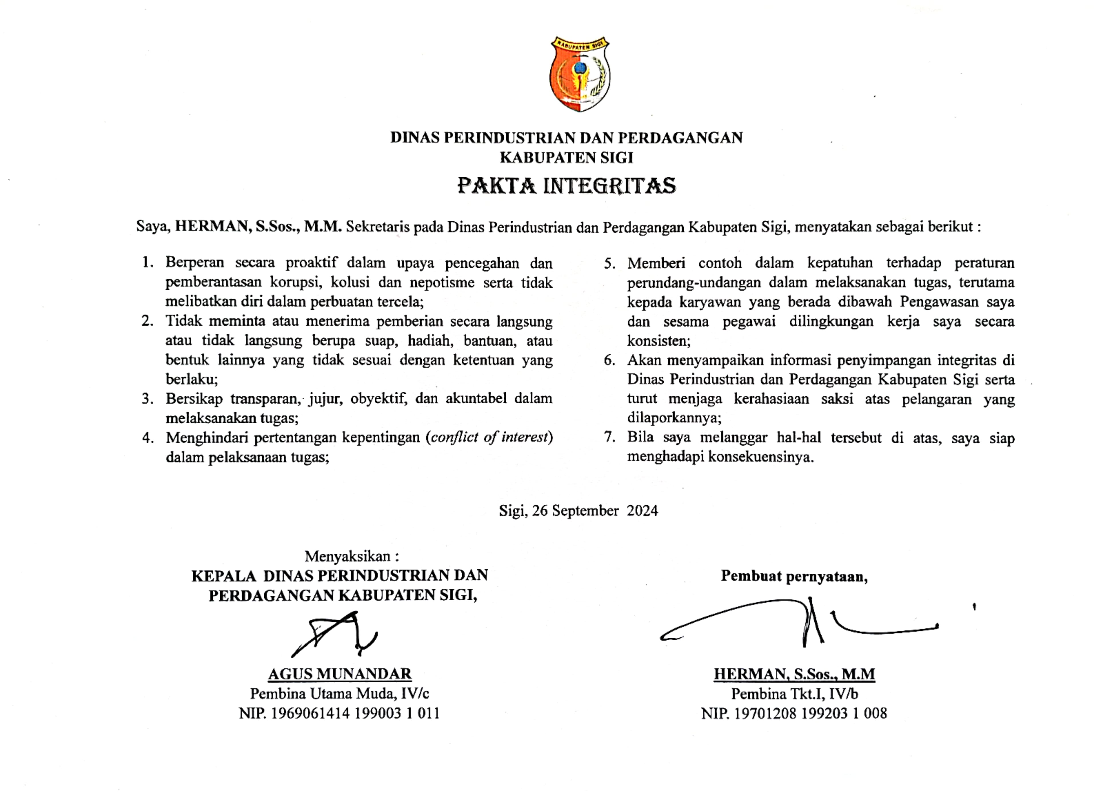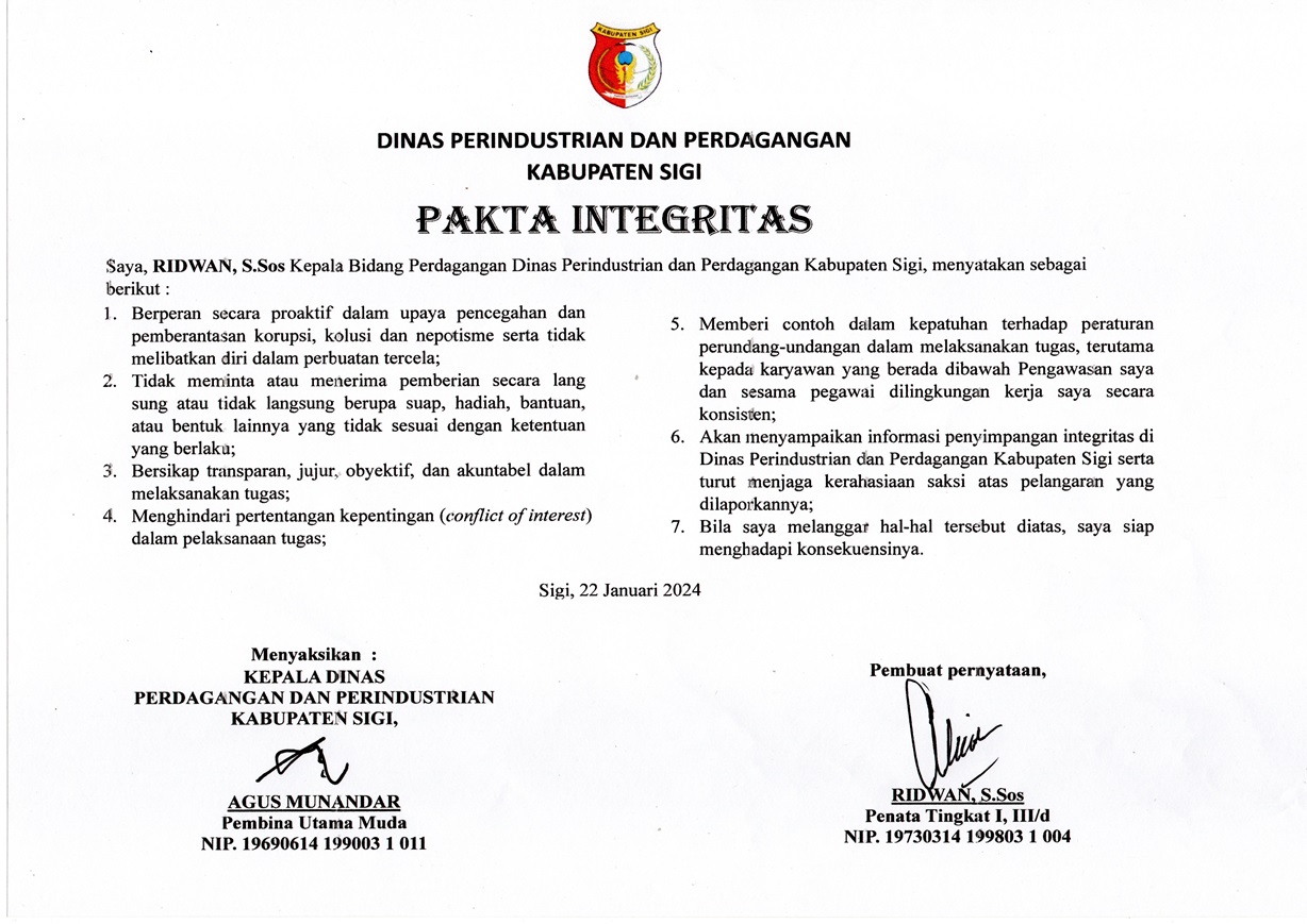 Penandatanganan Dokumen Pakta Integritas pada Dinas Perindustrian dan Perdagangan Kabupaten Sigi.