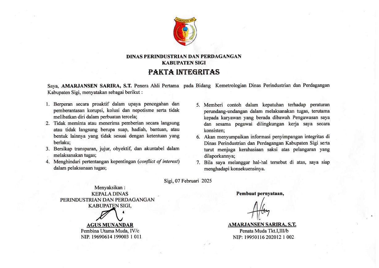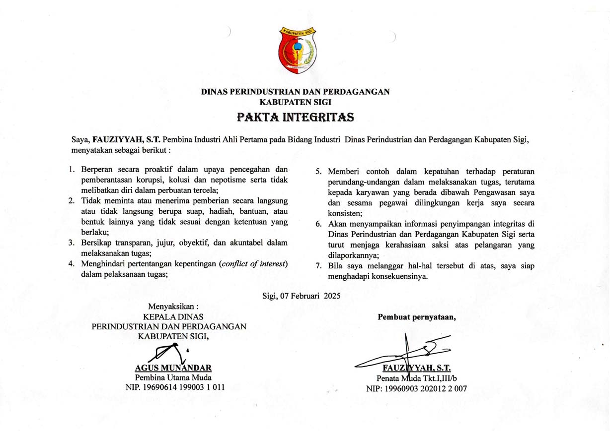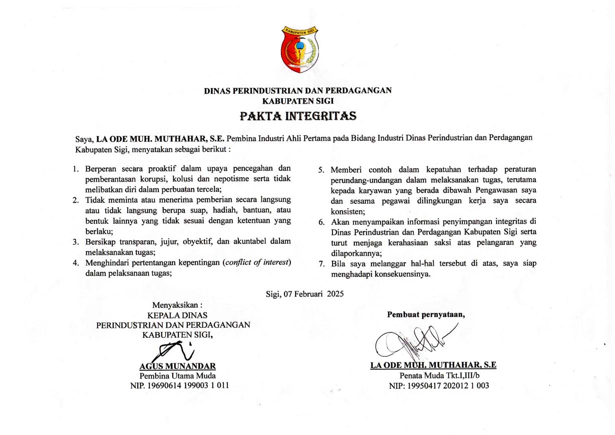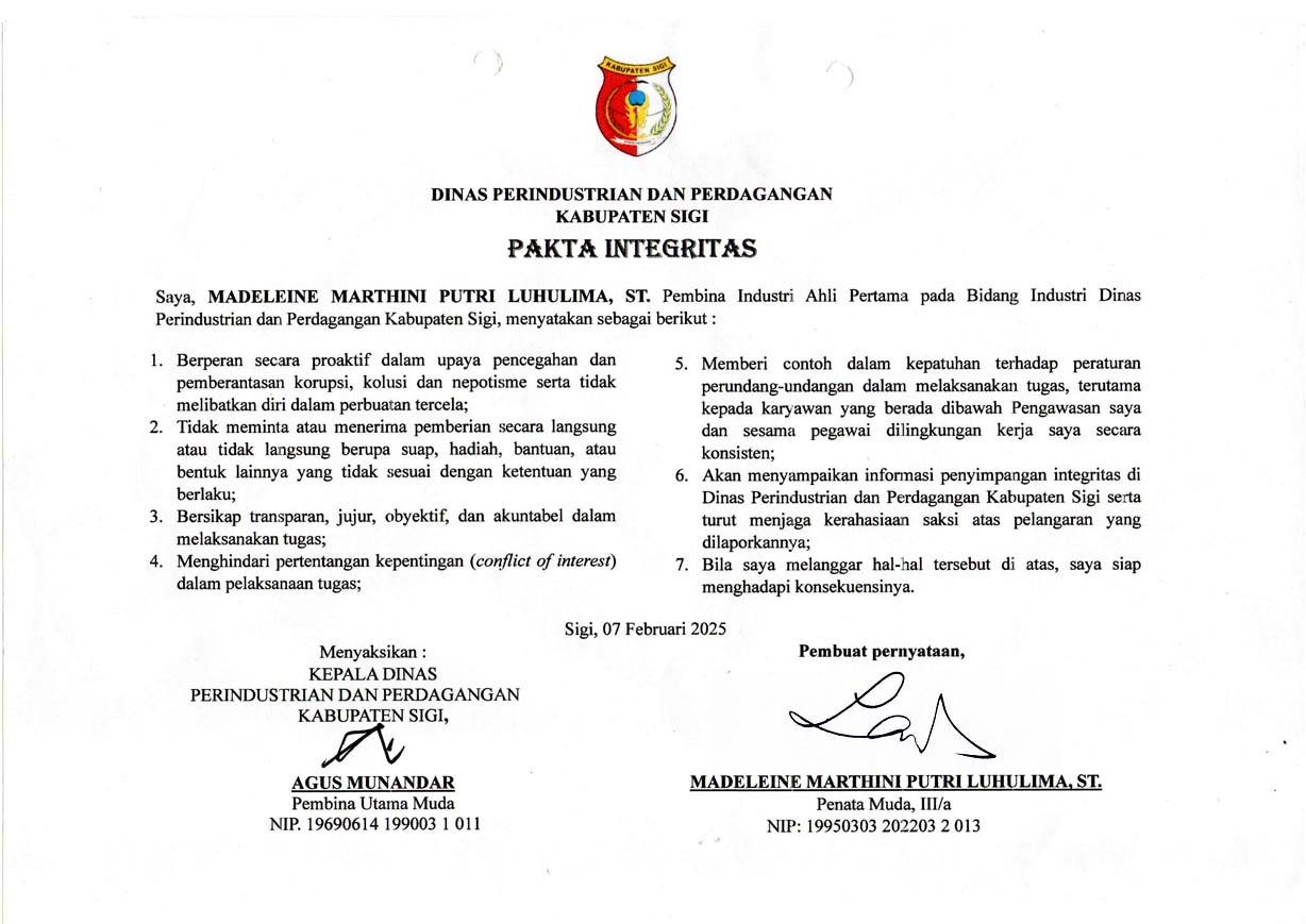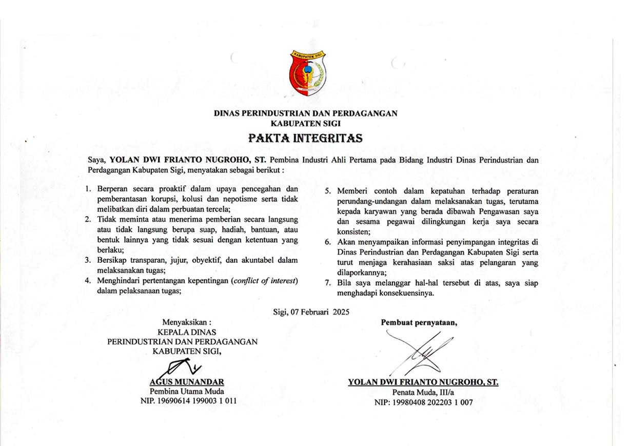 Penandatanganan Dokumen Pakta Integritas pada Dinas Perindustrian dan Perdagangan Kabupaten Sigi.