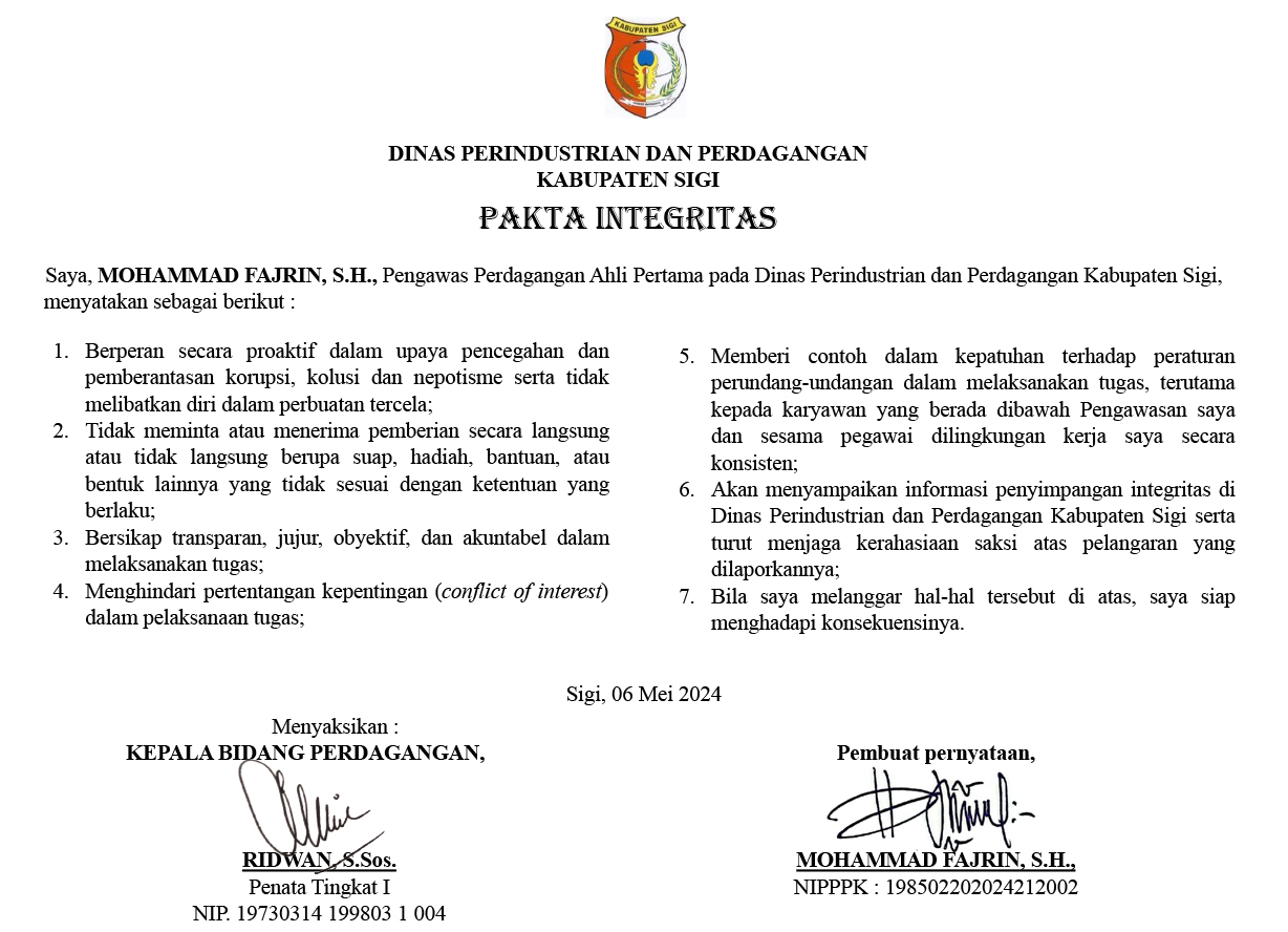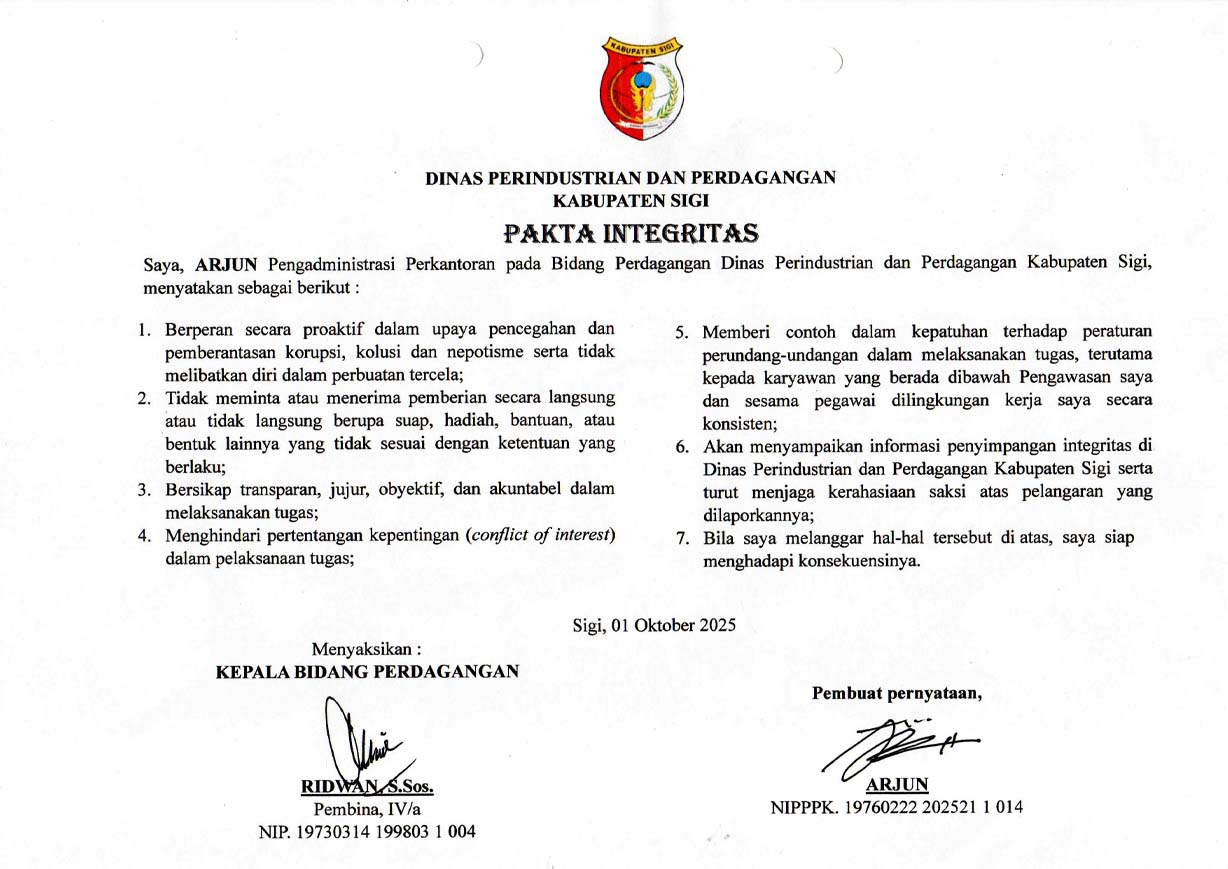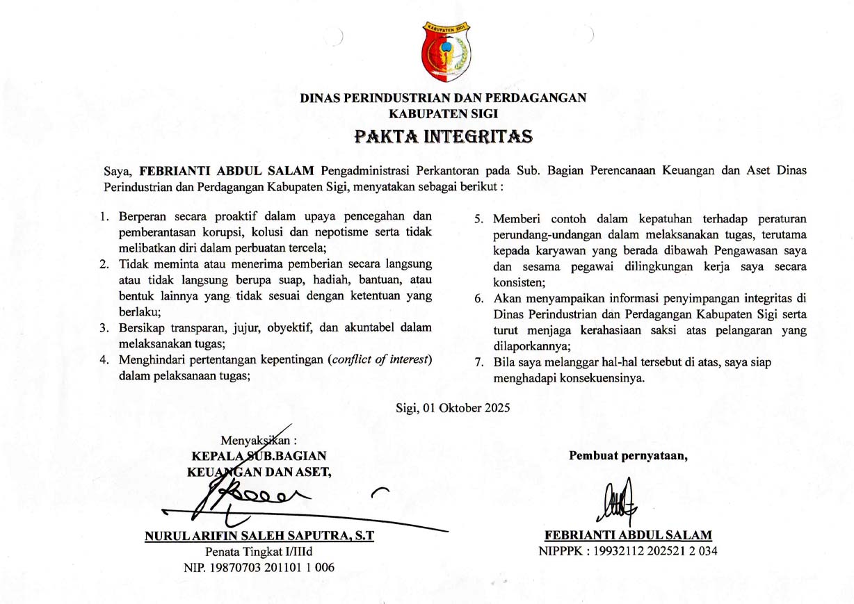 Penandatanganan Dokumen Pakta Integritas pada Dinas Perindustrian dan Perdagangan Kabupaten Sigi.
