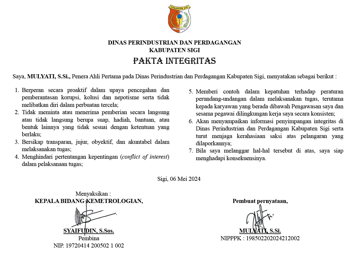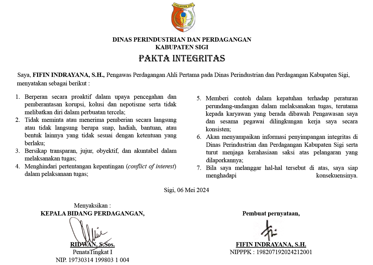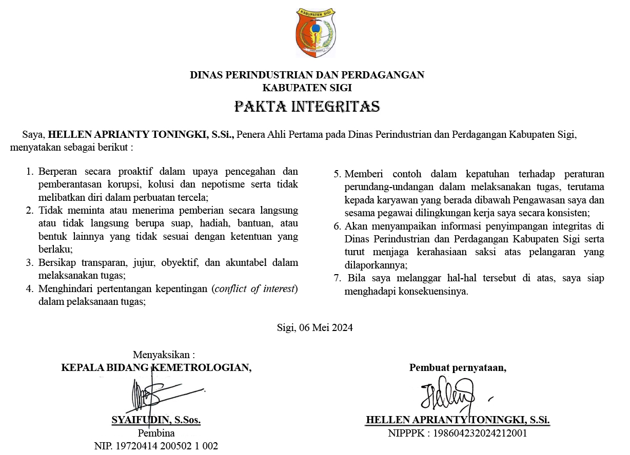 Penandatanganan Dokumen Pakta Integritas pada Dinas Perindustrian dan Perdagangan Kabupaten Sigi.