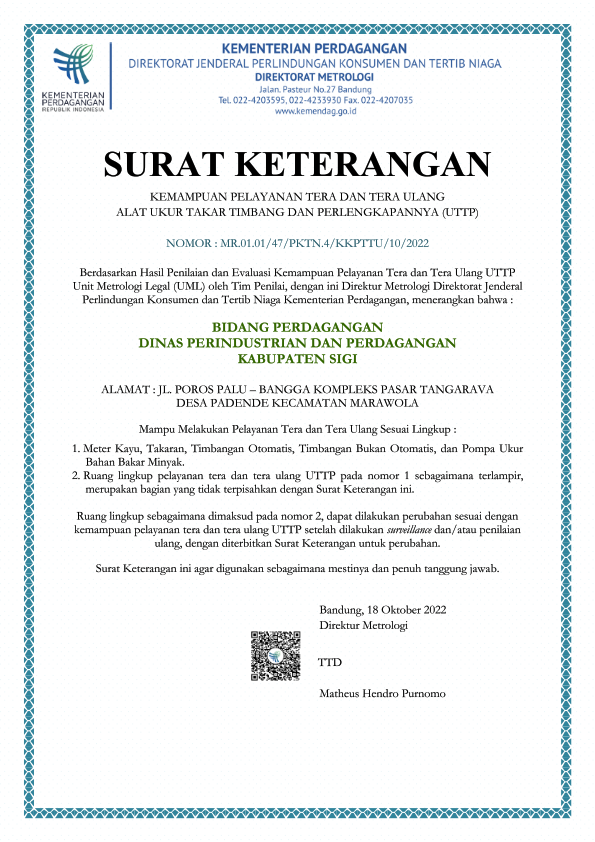 Kabupaten Sigi pada tahun 2022 telah memperoleh Surat Keterangan Kemampuan Pelayanan Tera/Tera Ulang (SKKPTTU) dari Kementerian Perdagangan RI melalui Direktorat Metrologi. Pemberian SKKPTTU ini setelah melalui tahap penilaian oleh Tim Penilai UML Direktorat Metrologi terhadap kelengkapan dan kesiapan sebagai syarat pembentukan UML yang mengacu pada Permendang Nomor 115 tahun 2018 tentang Unit Metrologi Legal. Syarat kelengkapan ini berupa; Peralatan standar pelayanan, SOTK, gedung/bangunan yang representaatif dan potensi UTTP. Kesiapan dalam hal ini berupa; panduan mutu, intruksi kerja alat, SOP pelayanan, serta SDM metrologi yang telah mengikuti diklat dan ukom.