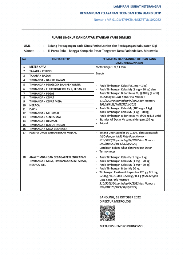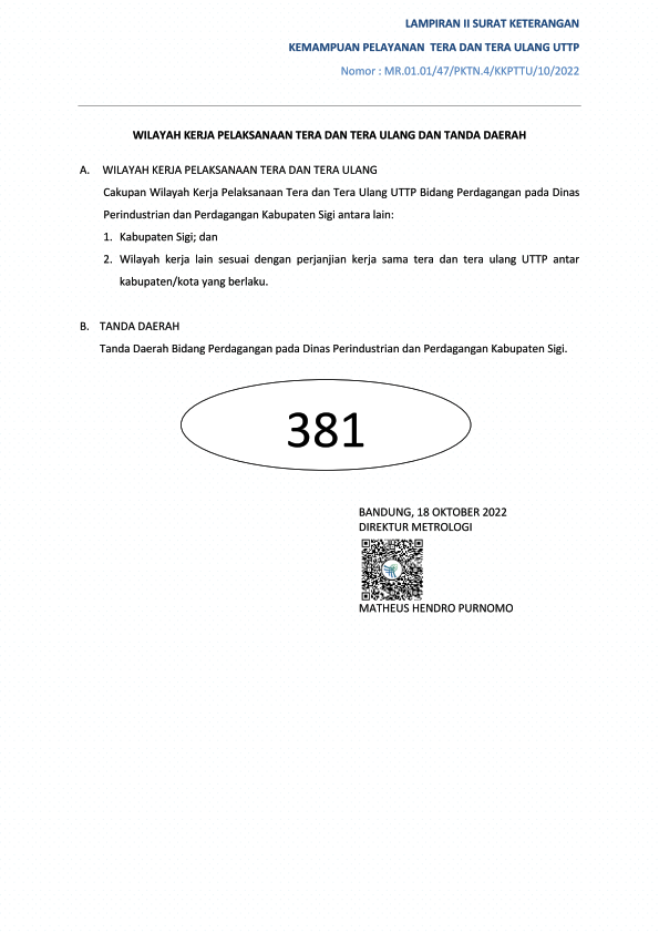 - Wilayah KerjaKabupaten Sigi dan Wilayah kerja lain sesuai dengan perjanjian kerja sama tera dan tera ulang UTTP antar Kabupaten/Kota yang berlaku